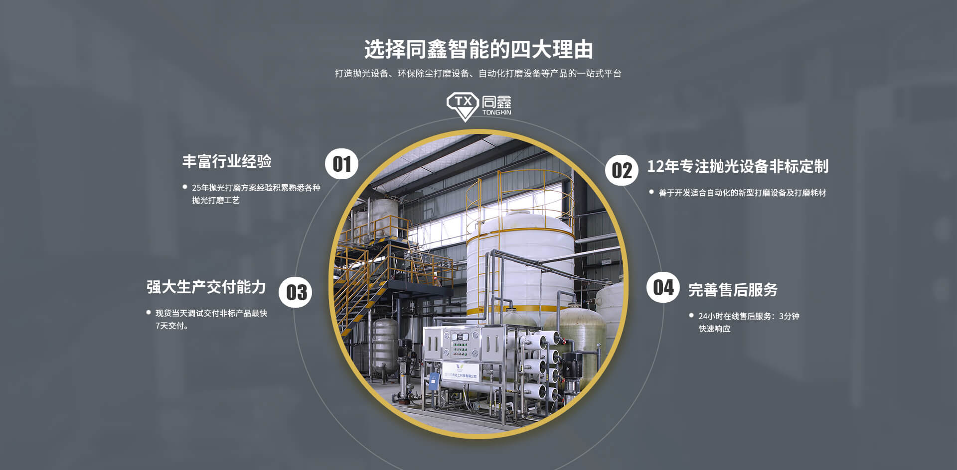 佛山市同鑫智能裝備科技有限公司位于廣東省大灣區(qū)腹地——佛山,成立于2009年4月,多年來一直致力于主要拋光打磨設(shè)備的研發(fā)生產(chǎn)和銷售。集焊接、打磨、噴涂、粉塵空氣凈化、智能廢水回收的技術(shù)研發(fā)、制造、銷售于一體的專業(yè)非標(biāo)自動(dòng)化設(shè)備的企業(yè),公司擁有一大批應(yīng)用高級(jí)工程師及技工人才,公司在技術(shù)上不斷創(chuàng)新、研討、不斷引進(jìn)先進(jìn)設(shè)備,技術(shù)日新月異,受到客戶一致好評(píng)。